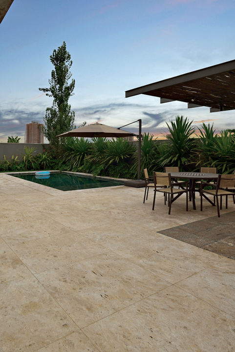 Projeto Simone Meirelles - Travertino Romano Bruto - Basaltina Honed (cinza da lareira e lavabo)