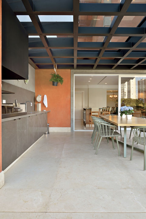Área social: piso mármore crema marfil polido | Escada: mármore crema marfil polido | Área cozinha e serviço: piso e bancadas quartzito Taj Mahal | Área externa: piso mármore crema Marfil Anticatto | Lavatórios do lavabo: Mármore Rojo Coralito | Bancada Sala almoço: Sólidus Quartz Absoluttu | Bancadas gourmet: Quartzo Green River | Bancada churrasqueira: Ultracompact Fokos Roccia